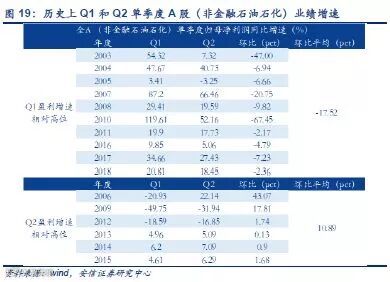 从历史上看,05年Q1 A股(非金融石油石化)归母净利润增速在上年Q4单季度大幅下滑后短暂反弹之后继续下滑。03年至今,全A(非金融石油石化)Q1单季度盈利增速较Q2处于更高位的情形共有10次,历史平均下滑17.52 pct;Q2单季度盈利增速较Q1环比提升的情形共6次,历史平均提升10.89 pct。单单比较这两个季度并没有明显的规律。但是考虑到2018年Q4A股业绩并不理想的情况,我们观察到05Q4大幅下滑后,隔年的Q2单季度盈利增速均相对Q1明显更高,盈利出现持续修复;而在04年Q4大幅下滑后,隔年的Q1单季度盈利增速均相对Q2更高,也就意味着盈利在Q1短暂修复后出现环比下滑。此外,在08、11年及15年Q4大幅下滑后,Q1和Q2 A股(非金融石油石化)单季度业绩增长并没有明显分化,只不过08年Q4大幅下滑后09年业绩增长开始好转,11年及15年则相反。
