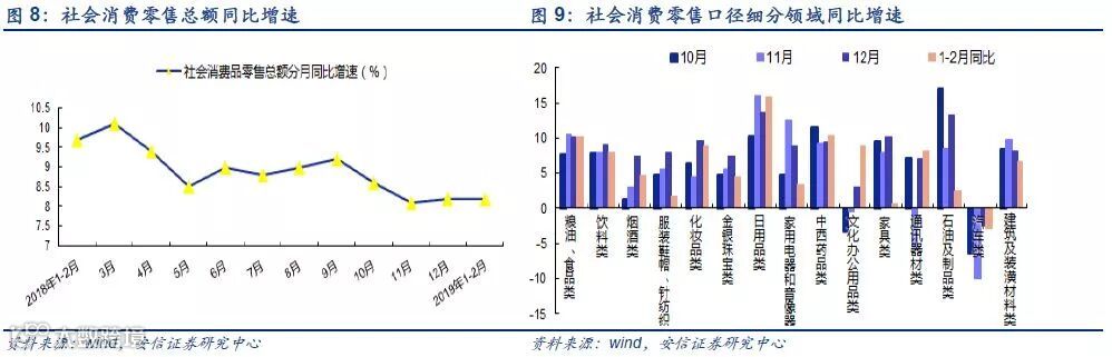 2019年1-2月份,社会消费品零售总额66064亿元,同比名义增长8.2%与12月持平,实现企稳。从结构来看,文化办公用品类、日用品类、通讯器材类、中西药品类等同比增速明显改善,分别环比提升5.8 pct、2.2 pct、1.1 pct和0.9 pct。