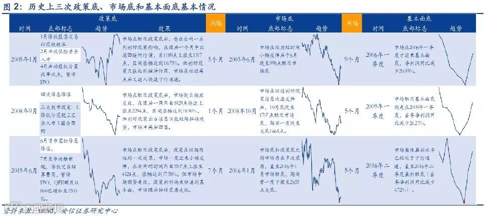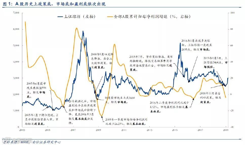 从“三重底”的视角来看,当前上证综指已经走出阶段性低位,A股基本面又处于盈利周期什么位置呢?2003年至今A股市场出现了多轮股市周期,在牛市熊市周期间政策、市场和基本面的变化出现了较大的关联性。具体而言,政府及监管部门在市场持续下跌的过程中通常会出台一系列的救市措施,这些政策通常能够刺激市场出现反弹,但由于熊市期间市场投资者情绪偏弱,政策利好仅能缓解部分危机,趋势传递至股市涨跌往往需要一段时间,但政策的界定和滞后的时长并不确定。同时,股市反应领先于基本面改善。