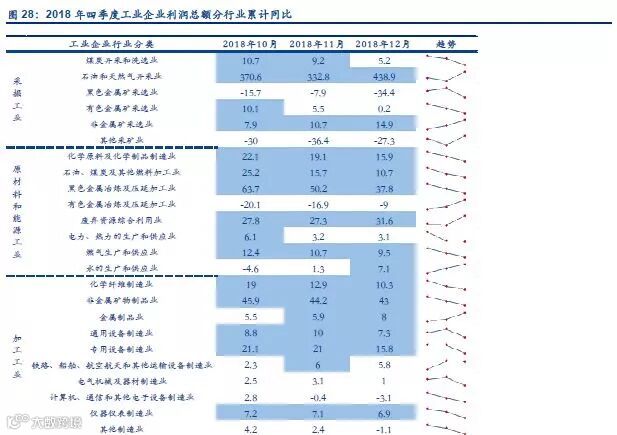 结合2018年四季度工业企业利润来看,这点已经开始显现。目前上中游行业盈利下滑较为明显,同时越来越多的下游行业盈利出现修复。根据18年四季度工业企业利润总额的累计同比增速,除石油和天然气开采业、非金属矿采选业、有色金属冶炼及压延加工业、金属制品业等少数行业外,上游采掘、原材料和能源及加工工业大多盈利持续放缓,同时越来越多的中下游行业盈利增速呈现上升趋势。根据18年12月工业企业利润总额的累计同比增速,盈利环比改善较为明显的下游行业有:农副食品加工(+3.3pct)、酒、饮料和精制茶制造业(+5.5 pct)、纺织服装服饰业(0.7pct)、文教、工美、体育和娱乐(+4.3pct)等。