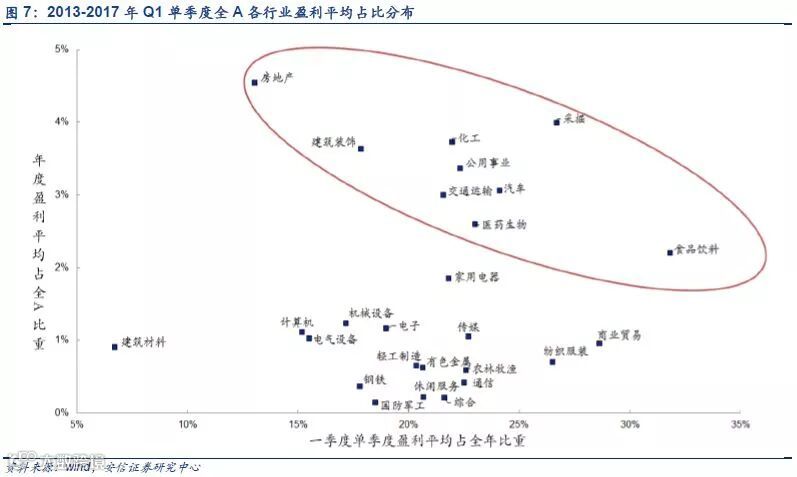 这点可以从各季度利润分中得到侧面印证,Q1盈利贡献消费行业占比较高,剔除金融行业(银行占比27.53%、非银金融占比25.52%),13-17年Q1盈利平均占全年比重超过25%的行业为:食品饮料(31.83%)、商业贸易(28.65%)、采掘(26.70%)、纺织服装(26.52%)。同时,我们选取结合各行业年度盈利平均占全A比重前10的一级行业进行观察(房地产(4.54%)、采掘(3.98%)、化工(3.72%)、建筑装饰(3.62%)、公用事业(3.36%)、汽车(3.05%)、交通运输(2.99%)、医药生物(2.59%)、食品饮料(2.20%)、家用电器(1.85%)):以Q1单季度盈利平均占全年比重为横轴、年度盈利平均占全A比重为纵轴构建坐标系,则分布越靠近右上角的行业对2019Q1全A业绩的贡献越大。不难看出,A股(非金融石油石化)Q1业绩中消费行业的作用相对是比较突出的。