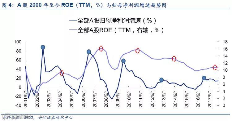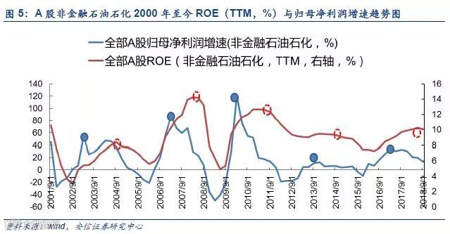 从历史ROE周期来看,本轮A股盈利真正的底部或将出现在2019年上半年。早在此前的外发专题《从ROE历史规律看当前A股盈利周期位置》中,我们就从2000年至今全部A股及非金融石油石化ROE(TTM,%)与归母净利润增速趋势图观察到,2000年至今A股盈利增速和ROE变化均维持一个3-4年的周期,同时ROE指标往往较为钝化,高点往往滞后盈利增速最高点1-2年。更重要的是,我们发现ROE向下拐点往往是整个A股盈利周期约三分之一处,同时意味着盈利增速下滑周期已经快接近半程。