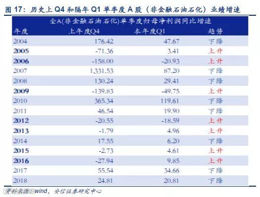 此外,从历史上看,在上一年Q4大幅负增长以后,Q1 A股(非金融石油石化)大概率环比修复。03年至今,A股(非金融石油石化)Q1单季度盈利增速均较好,除06(-20.93%)、09(-49.75%)、12年(-18.59%)出现负增长外,其余年份Q1均为正增长。其中,06年是因为此前增长较快,使得同期基数较高,09年和12年则与当时宏观经济形势大幅恶化相关,而这两点与当前基本面环境并不吻合。同时,我们观察到04、05、08、11、15年Q4大幅下滑后,隔年的Q1单季度盈利增速均相对Q4更高。