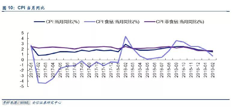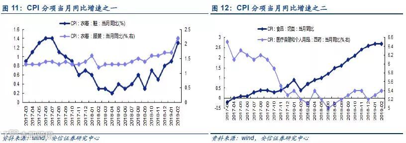 2019年1、2月CPI当月同比分别为1.7%、1.5%,延续了自2018年10月以来的下行趋势。其中,非食品分项1、2月同比与18年12月水平持平。与此同时,部分消费品及服务的CPI当月同比自2019年以来呈上涨趋势。如鞋类、服装类、食品奶类、医疗保健西药类的CPI同比19年1、2月分别累计提升0.5 pct、0.6 pct、0.1 pct和0.2 pct。