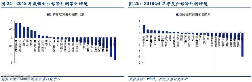 从年报预告计算得出的18Q4归母净利润增速来看,前五的行业分别为:公用事业(251.99%)、化工(104.50%)、食品饮料(91.32%)、国防军工(73.16%)、采掘(67.72%);后五的行业分别为:传媒(-778.88%)、纺织服装(-224.78%)、非银金融(-200.43%)、有色金属(-190.90%)、机械设备(-166.28%)。
