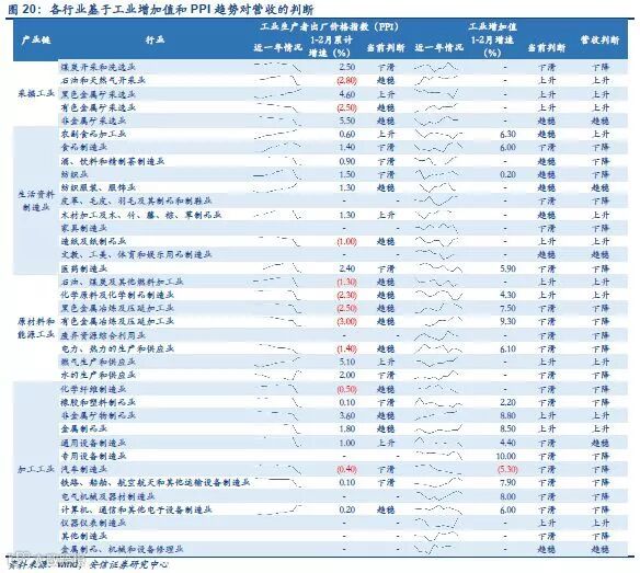 下游生活资料制造业:分化明显,必需消费品较好。与上游行业的情况相反,生活资料制造业的盈利与量的关系更为紧密。从PPI的角度来看,生活资料制造业营收影响因素分化情况较大,部分行业价格变动幅度较小但工业增加值量变化较大,如造纸业,部分行业量的变化逐渐趋稳但价格变动幅度较大,如农副食品加工业和纺织业等。其中,1-2月已公布工业增加值增速的行业有农副食品加工业、食品制造业和纺织业,分别为6.3%、6.0%和0.2%。