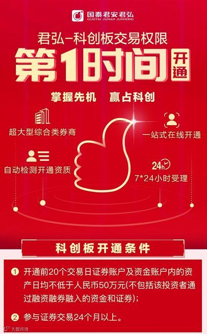 另据了解,早在8日下午,此前开通线上预约开户功能的国泰君安证券,已经率先帮投资者完成了科创板权限开通。“开通的流程远比想象的简单,达到开通科创板权限标准,如果适当性匹配,只需要签署适当性评估结果确认书、风险揭示书并回答知识测评,通过即可办理,整个流程迅速快捷。”国泰君安相关负责人表示。