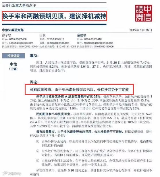 2015年6月28日,邵子钦团队又出了一篇重磅报告,题为《换手率和两融预期见顶 建议择机减持》。