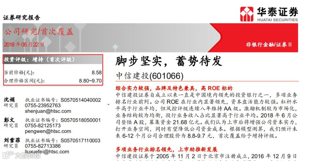 值得注意的是, 2018年6月,中信建投登陆A股,募集资金 21.68 亿元。华泰证券沈娟团队发布研报称,上市后将增强公司资本实力,打开业务空间,同时有望降低公司资金成本。根据模型测算,预计未来6-12个月公司合理股价为8.8~9.7元,给予增持评级。