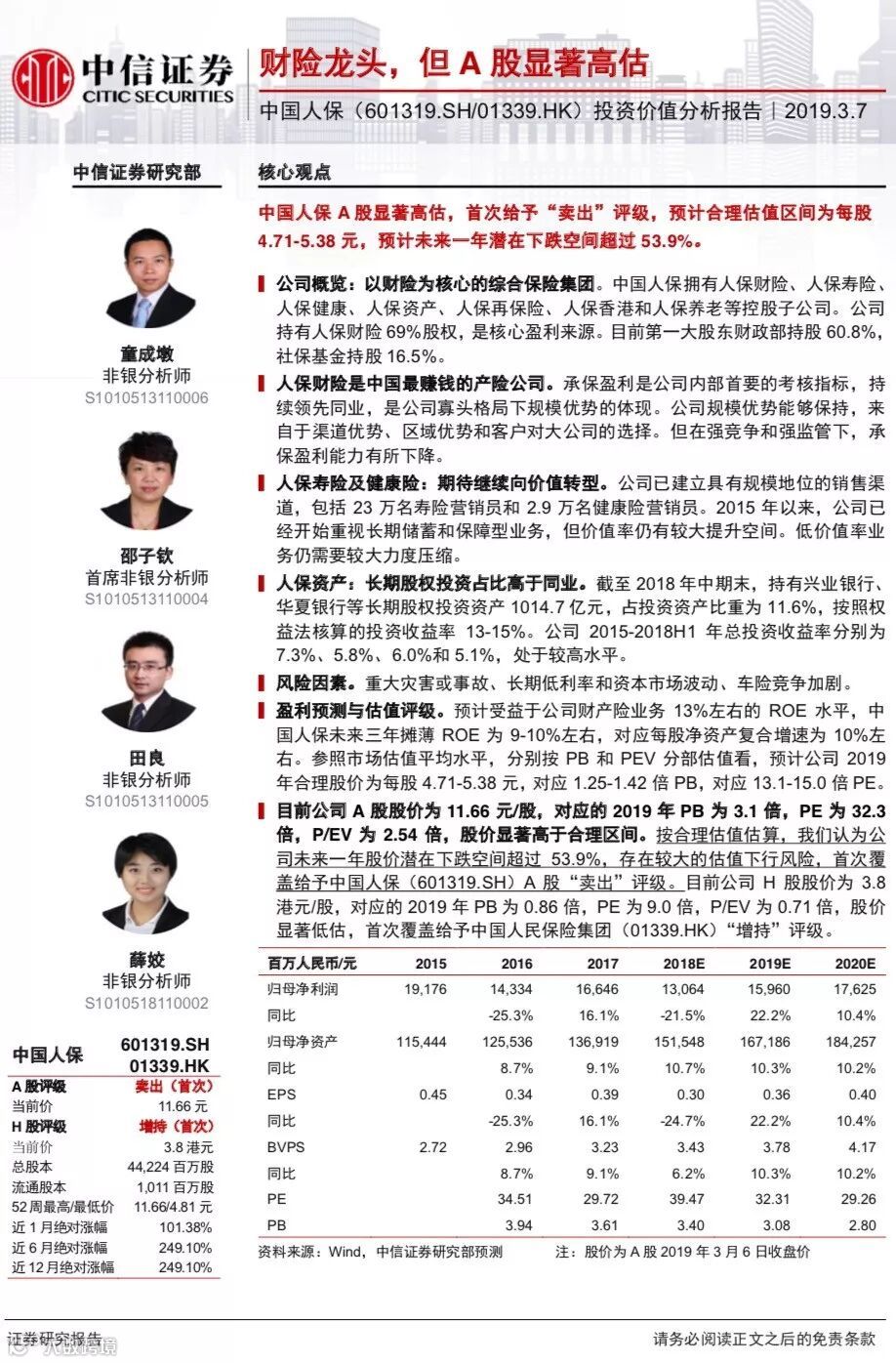 3月7日,中信证券发布研报看空中国人保,3月8日,华泰证券发布研报看空中信建投。