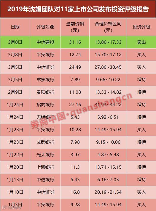 据券商中国记者梳理发现,3月份以来,沈娟团队共对4只股票发布评级报告,除了“轰动”市场的中信建投“卖出”评级外,其余均是“买入”和“增持”评级。具体来看,3月8日,沈娟团队对平安银行发布“买入”评级,3月5日分别对中信证券和常熟银行发布“买入”和“增持”评级。