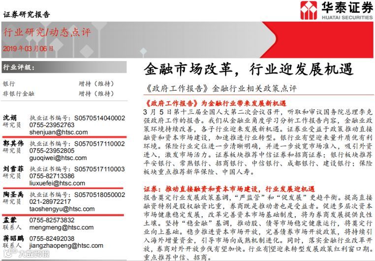 3月6日,沈娟团队发布了题为《金融市场改革,行业迎发展机遇》的研报,《政府工作报告》为金融行业带来发展新机遇。证券业受益于政策推动直接融资和资本市场建设,加速推进行业转型。银行业有望迎来量升质优有利环境。保险行业定位进一步清晰明确,并进一步放宽市场准入,吸引外资进入,激发市场活力。证券板块推荐中信证券和招商证券;银行板块推荐平安银行、常熟银行、招商银行、中信银行、成都银行、建设银行;保险板块重点推荐新华保险、中国人寿。