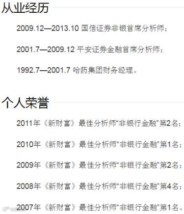 2010年《新财富》最佳分析师“非银行金融”第1名;