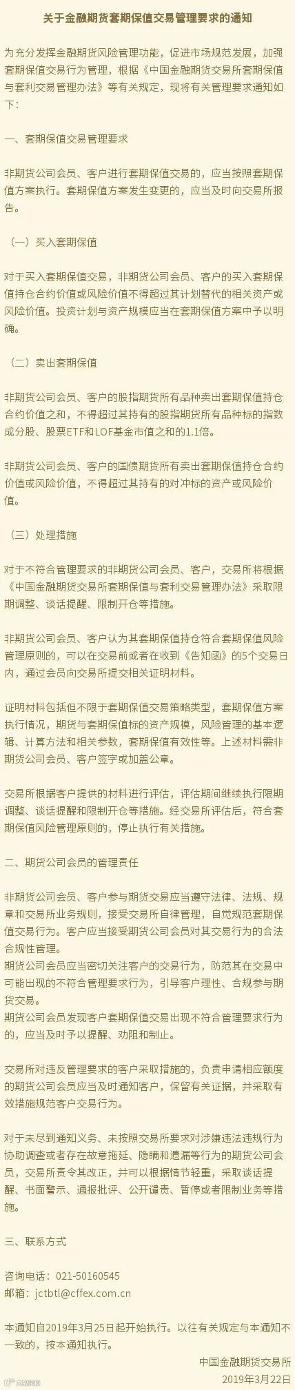 2019年3月22日,中国金融期货交易所(以下简称中金所)发布了《关于金融期货套期保值交易管理要求的通知》(以下简称《通知》)。《通知》将于2019年3月25日起正式实施。