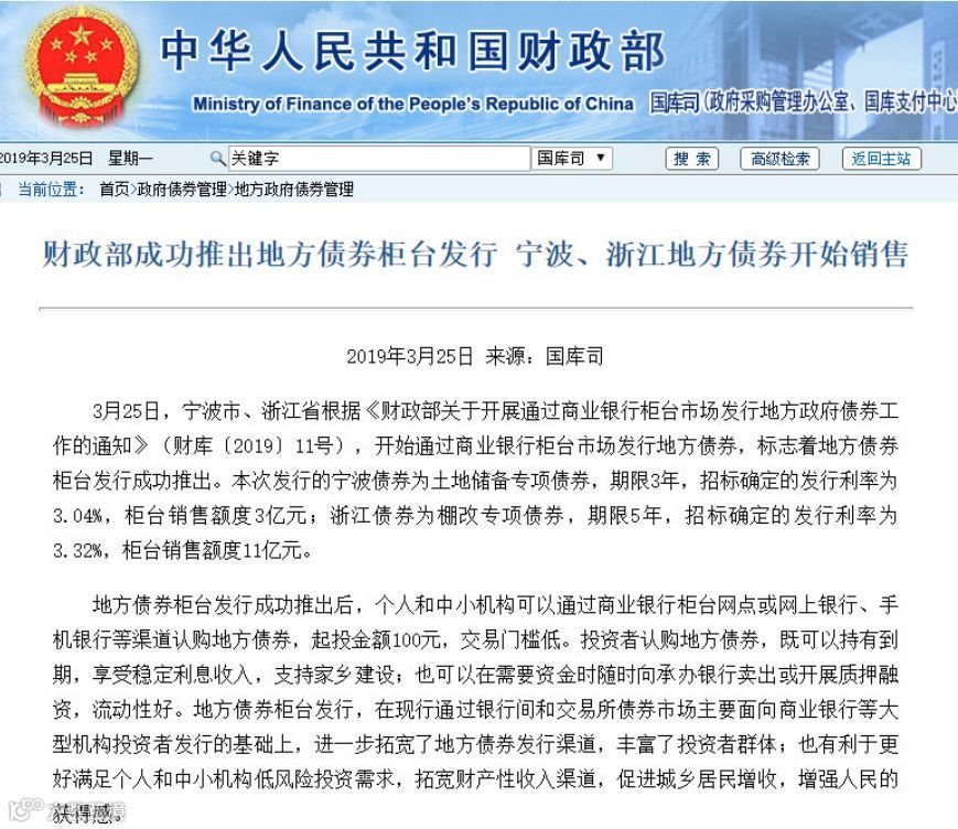 3月25日,第一批地方债——宁波债券和浙江省债券正式在柜台发售。宁波债券为土地储备专项债券,期限3年,招标确定的发行利率为3.04%,柜台销售额度3亿元;浙江债券为棚改专项债券,期限5年,招标确定的发行利率为3.32%,柜台销售额度11亿元。