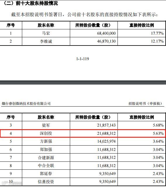 值得注意的是,睿创微纳的前十大股东中,以公司高管自然人股东居多,机构投资者中较为知名的是深创投,目前持有21688312 股,占股份睿创微纳股本总额的 5.63%,深创投于2018年4月2日和2018年12月26日分两次增资以定增的方式取得睿创微纳目前的股权。