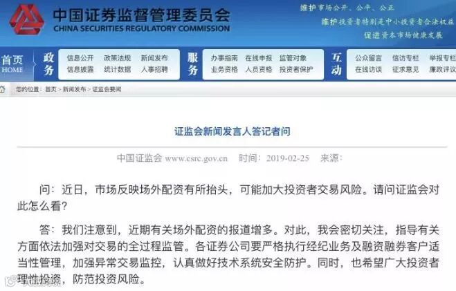 针对卷土重来的场外配资,证监会2月25日表示,对此密切关注,指导有关方面依法加强对交易的全过程监管。各证券公司要严格执行经纪业务及融资融券客户适当性管理,加强异常交易监控,认真做好技术系统安全防护。同时,也希望广大投资者理性投资,防范投资风险。
