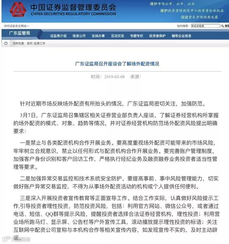 3月7日,针对近期市场反映场外配资有所抬头的情况,广东证监局召集辖区相关证券营业部负责人座谈,了解证券经营机构所掌握的场外配资的模式、对象、趋势等情况,并对证券经营机构防范场外配资风险提出明确要求: