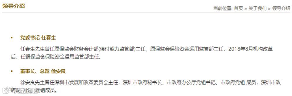董事长、总裁徐安良,曾任深圳市发展和改革委员会主任,深圳市政府秘书长、市政府办公厅党组书记、市政府党组 成员,深圳市政府副市长、党组成员。