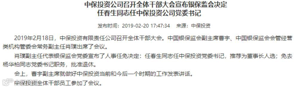 2月18日,中保投资有限责任公司(下称“中保投资”)召开全体干部大会。中国银保监会会管经营类机构管委会常务副主任肖璞代表银保监会党委宣布了人事任免决定:任春生任中保投资党委书记,推荐为董事长人选;免去杨华柏同志党委书记职务,批准退休。