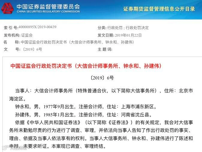 因出具的审计报告存在虚假记载,大信会计师事务所及该会所涉事会计钟永和、孙建伟遭罚没共计260万元,且两名注册会计师被采取五年证券市场禁入措施。这也是证监会2019年开出的首张市场禁入罚单。