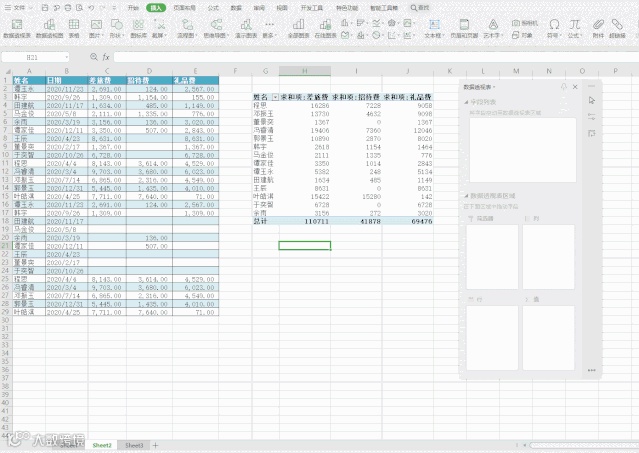 统计要求:利用数据透视表汇总三项费用,隐藏统计表中的零值;