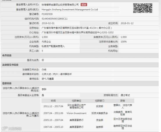 金晟硕业投资是一家新公司,成立于2018年1月12日,在今年2月1日完成私募资产配置管理人登记,公司法定代表人李晔曾经在美国道富银行、Vision Investment等机构任职。