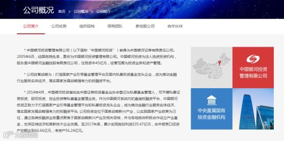 2014年4月,中国银河投资首批登记为私募基金管理人,至2017年底,累计实现税后利润105.47亿元,合并报表口径资产总额达到66.66亿元,净资产56.24亿元。