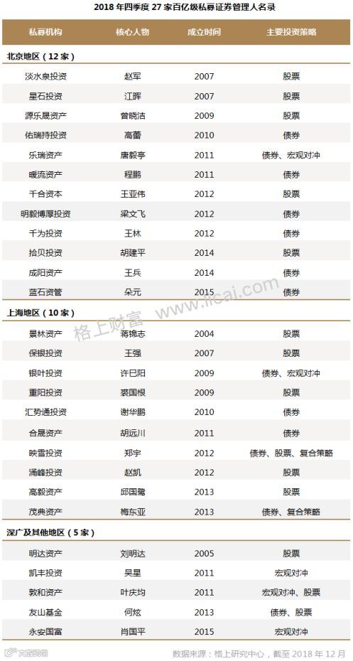 据格上研究中心最新统计,截至2018年底,百亿级私募证券管理人共有27家,其中北京有淡水泉投资、星石投资、源乐晟投资等12家百亿私募,数量居首。上海有10家,包括景林资产、高毅资产、重阳投资等;深广及其他地区有5家,包括凯丰投资、明达资产、敦和资产等。