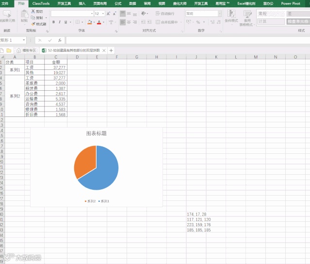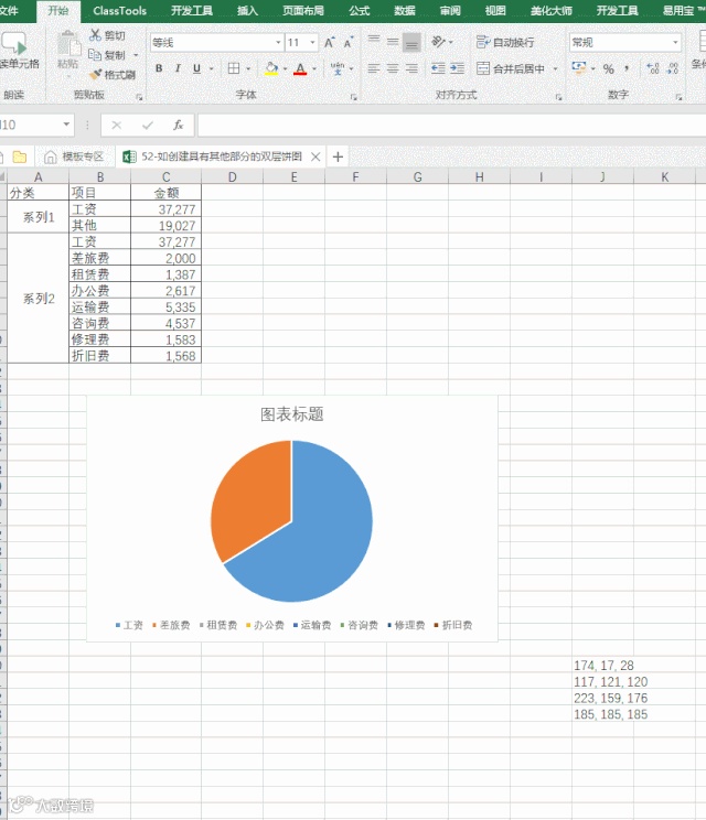 日常工作中我们都会用复合饼图来表示不能再一个饼图中显示的“其他”部分,今天我们要分享的是通过双层饼图错位显示“其他“部分,让饼图阅读性和层次感更强,具体操作步骤如下: