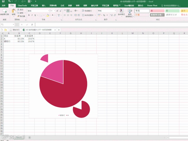 今天的双层饼图与《每日一图》第42篇的双层饼图不一样。本次分享双层饼图分别只显示部分,且大小不一样,凸显某一层的完成率,有一定的层次感,不一样的美。今天我们就来分享如何制作。