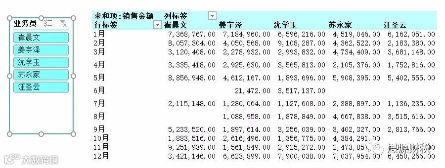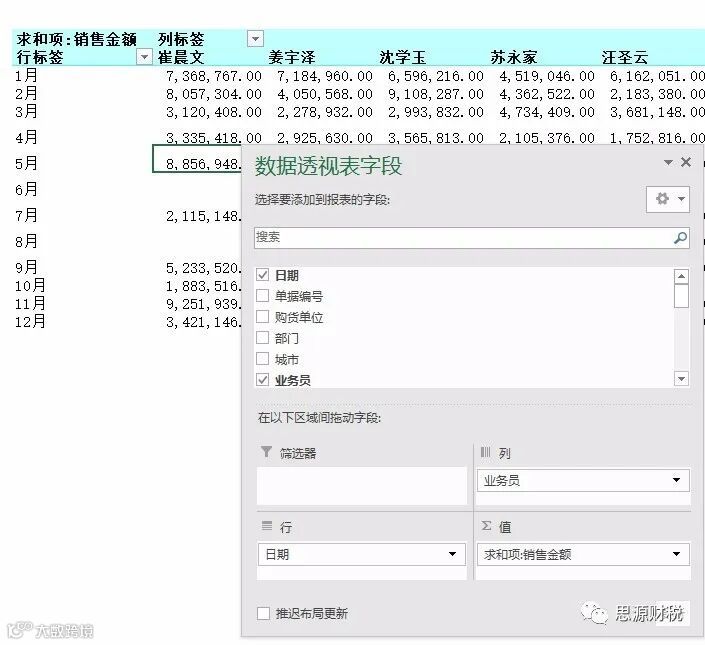创建数据透视表,行:月份,列:业务员,值:销售金额,如图1-1;