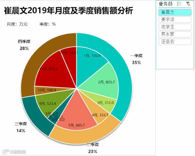 第十步:通过切片器筛选,饼图就会动起来,如图1-10;