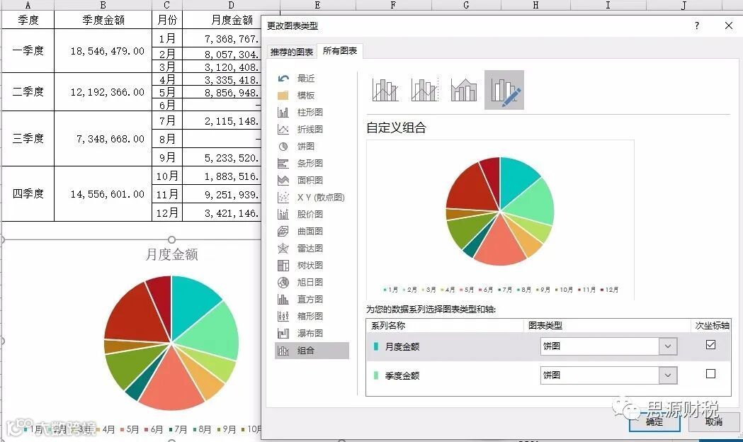 第六步:更改图表类型,将月度金额更改为次坐标轴,如图1-6;