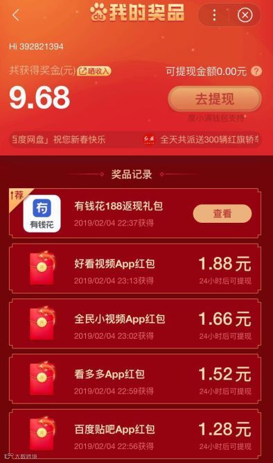 从大家晒出的百度红包来看,除了有现金红包,还有各类百度旗下产品如“有钱花”(消费信贷)/好看视频app/百度贴吧app/百度网盘等多个app的冠名红包: