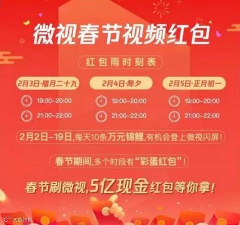从官宣口径来看,农历2018年春节红包奖金至少30亿元:支付宝集五福奖金5亿元,百度瓜分19亿元红包(春晚直播期间9亿元),腾讯微视也要发5亿,今日头条也称发出新年10亿红包雨,这里面多闪发1亿,抖音打算发5亿,此外还有新浪微博“锦鲤红包”的数亿元主题红包。