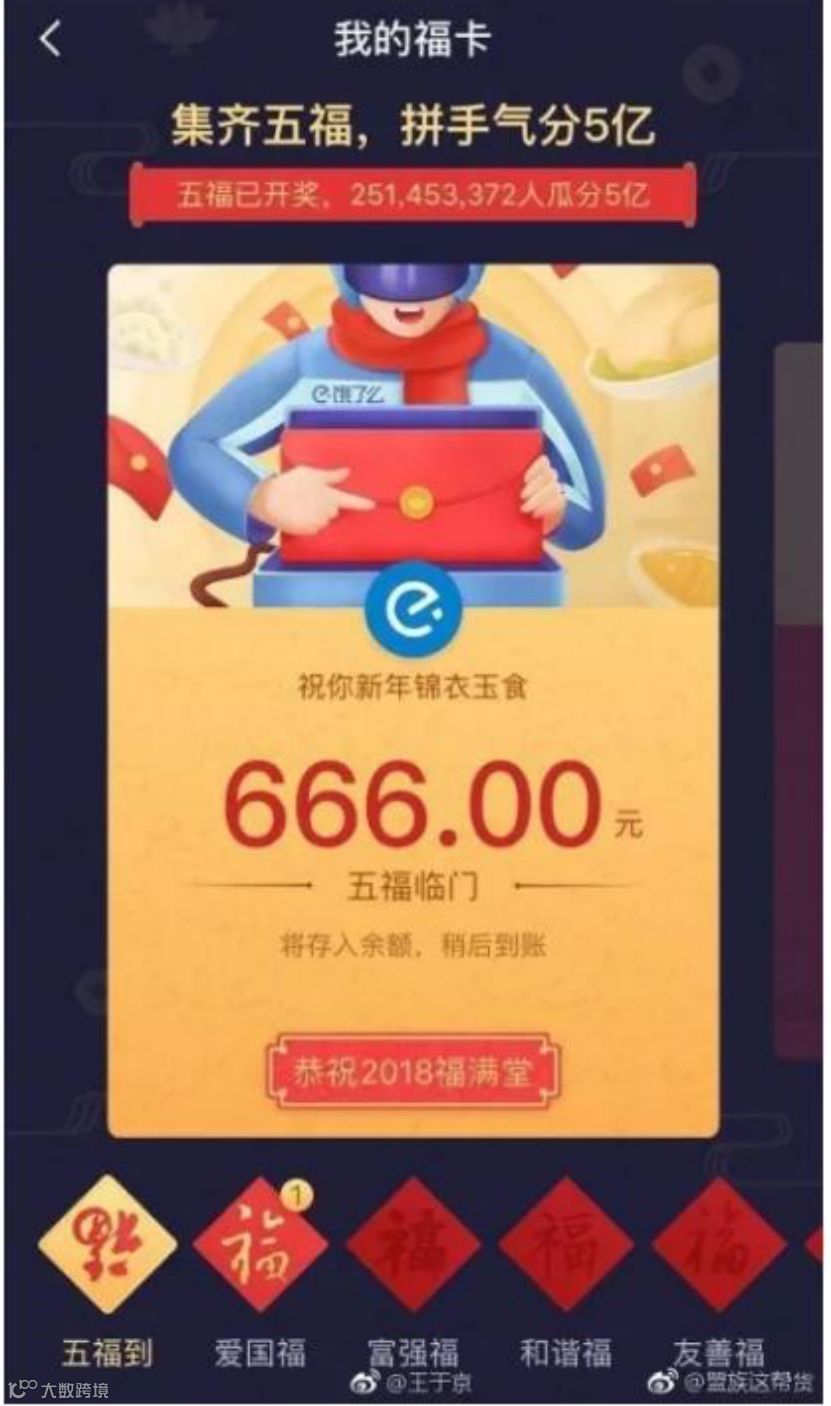 2016年,支付宝首次成为央视春晚独家互动合作平台。那年除夕当晚,支付宝一共拿出了8亿现金红包,除了多轮超1亿元的拼手气红包外,也在彼时推出了集福卡的活动,集齐五福的用户可共同平分2.15亿元现金红包。