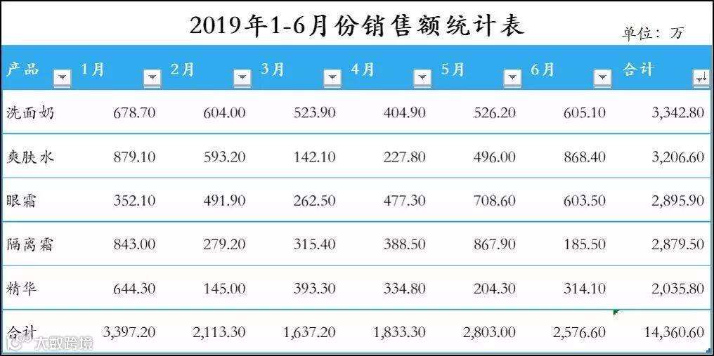 数据源:1-6月份各产品销售额统计表