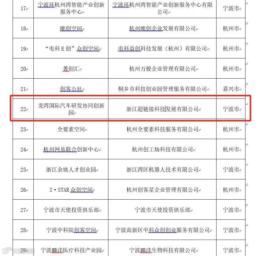 根据《浙江省众创空间备案管理办法》(浙科发高〔2021〕24号)和《关于组织开展省级科技企业孵化器和省级及以上备案众创空间绩效评价工作的通知》相关要求,浙江省科学技术厅对省级备案众创空间开展绩效评价,由超链接平台运营管理的“龙湾国际汽车协同创新园”在2022年度绩效评价为:省级优秀(A类)众创空间。