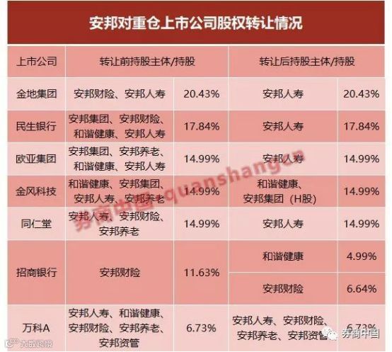 此外,2018年6月和9月,安邦保险集团先后两次对持有的多家上市公司股票进行集中式内部转让。转让后,安邦财险的持股上市公司数量明显减少。
