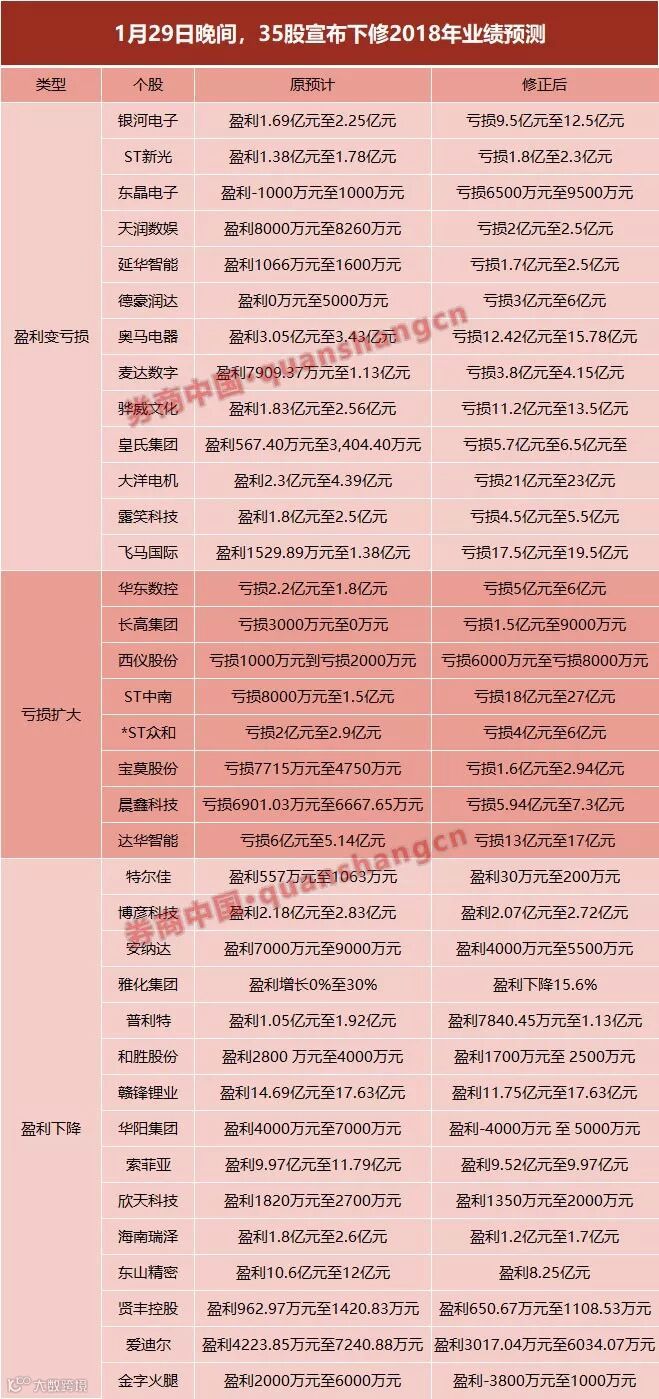 同时,当晚有35股宣布对预测业绩进行下修,13只股票的业绩预测由盈利骤然转为亏损,亏损规模较大的包括:
