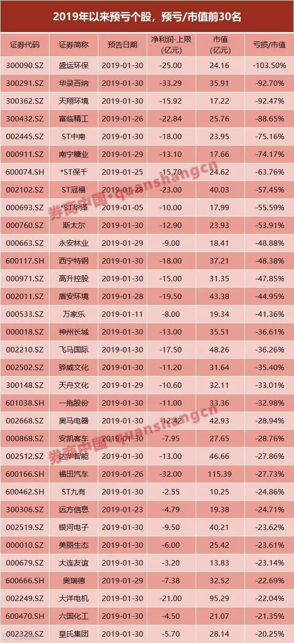 其中,盛运环保、华录百纳、天翔环境、富临精工、ST中南和南宁糖业等6股的预亏对市值比例超70%。