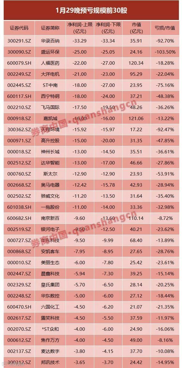 仅就1月29日的一天数据来看,两市共有48股预计年亏损超1亿元,36股预计年报亏损超3亿元,16股预计年报亏损超10亿元。