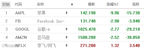 苹果领跌美国科技股,“FAANG”股票中奈飞“唯一幸免”。截至收盘,苹果收跌9.96%,Facebook收跌2.9%,谷歌母公司Alphabet收跌2.77%,亚马逊收跌2.52%,奈飞则收涨1.32%。