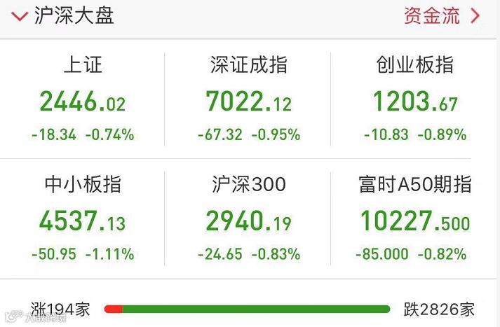 A股三大股指全线低开,沪指开盘跌0.74%,击穿2449点,创出自2014年11月21日以来四年多新低,深证成指低开近1%,创业板低开0.9%。