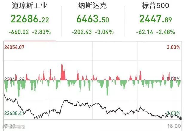 1月3日,标普500指数收跌62.14点,跌幅2.48%,报2447.89点。道琼斯工业平均指数收跌660.02点,跌幅2.83%,报22686.22点。纳斯达克综合指数收跌202.43点,跌幅3.04%,报6463.50点。