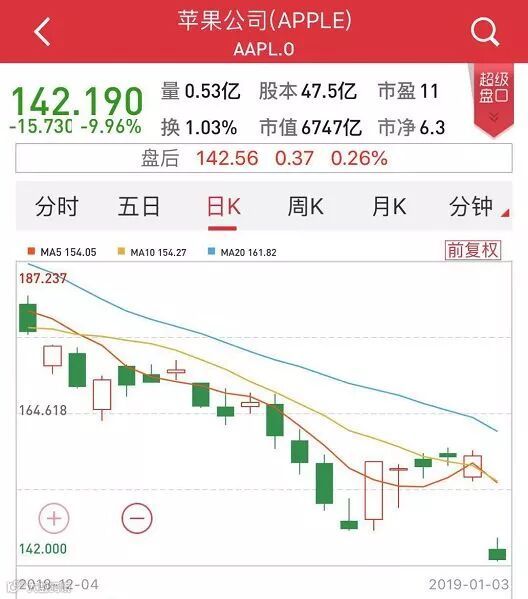 苹果的暴跌源自苹果意外发出第一财季业绩预警。苹果CEO库克在2019年首个交易日盘后,发布了致股东公开信:苹果将截止2018年12月29日的2019财年第一季度营收预期下调为840亿美元。值得注意的是,此次苹果公司下调营收预期,为其十六年来首次下调。
