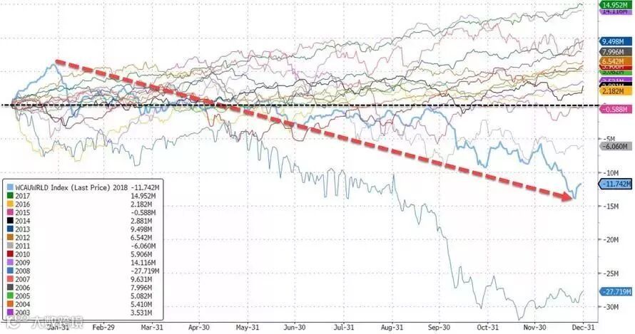 据华尔街见闻统计,全球股市在过去这一年间市值暴跌了将近12万亿美元。如此大的市值缩水幅度是金融危机以来的最大规模,也是历史上的第二大纪录。