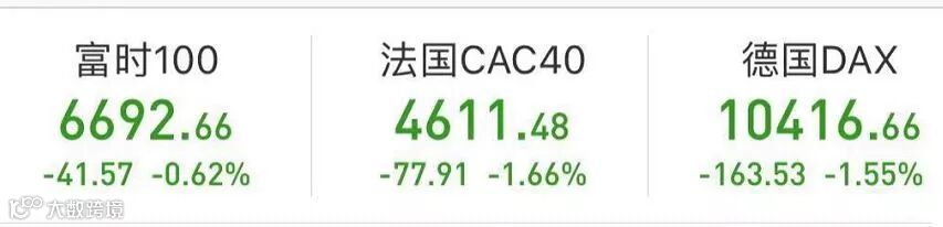 3日,欧洲市场也出现普跌。富时泛欧绩优300指数收跌0.71%,报1320.15点。英国富时100指数收跌0.62%,报6692.66点;法国CAC 40指数收跌1.66%,报4611.48点;德国DAX 30指数收跌1.55%。
