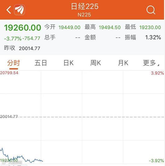 日经225指数2019年首个交易日低开1.8%,东证指数低开1.7%。盘中两大指数持续下挫,跌幅均超过3%。截至券商中国发稿,日经225跌幅扩大至3.8%。